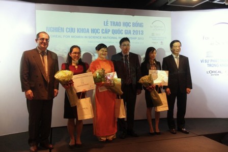 Ảnh: Hoàng Tuyết. Công ty L’Oreal Việt Nam đã tổ chức buổi lễ trao tặng học bổng “L’Oreál– UNESCO Vì sự phát triển nữ giới trong khoa học năm 2013” cho 3 nữ nghiên cứu khoa học trẻ tại Việt Nam. TS Vũ Thị Hạnh Thu với đề tài nghiên cứu: “Chế tạo và nghiên cứu màng hai lớp quang xúc tác và diệt khuẩn ZnO/TiO2 được biến tính bể mặt bởi nano Ag”. Học bổng trên không chỉ tương trợ về vật chất mà còn góp phần nhận diện và vinh danh các tài năng mới.